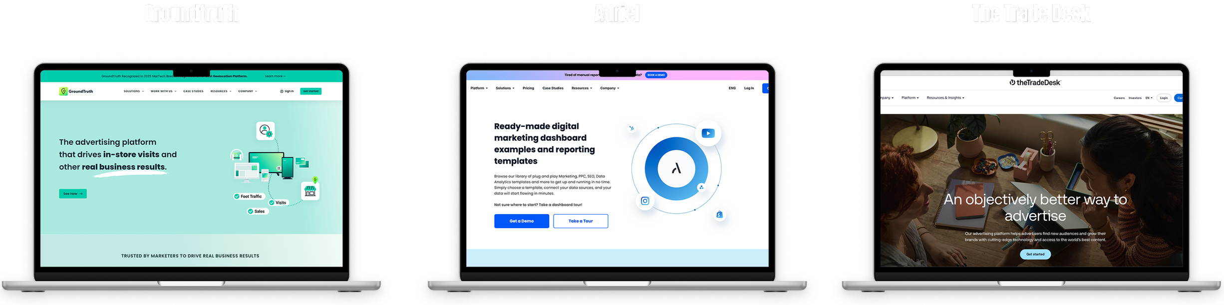 I conducted a competitive analysis of GroundTruth, Adriel, and The Trade Desk to understand how landing pages communicate transparency and guide users through ad purchasing. Key patterns around navigation, content hierarchy, and the use of visuals and education informed my approach to creating a clearer structure, stronger visual hierarchy, and a more approachable entry point for new users.